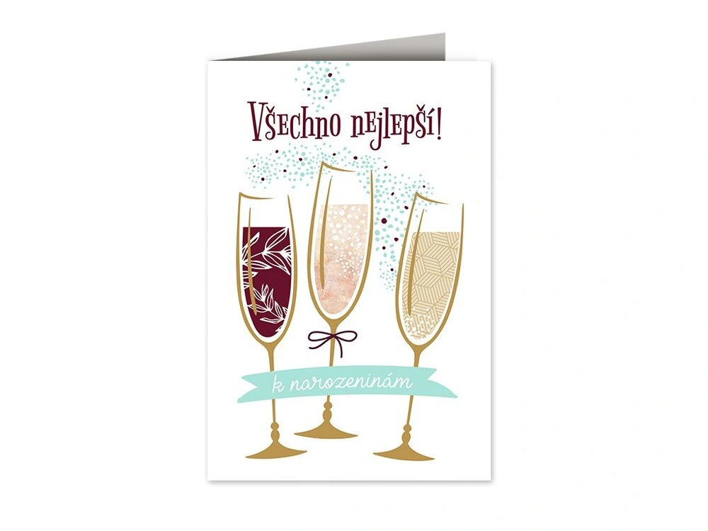 Decentní, ale barevné přání se sklenkami vína s nápisem "Všechno nejlepší k narozeninám" potěší ženy i muže. Alkoholik, abstinent, na tom nezáleží.