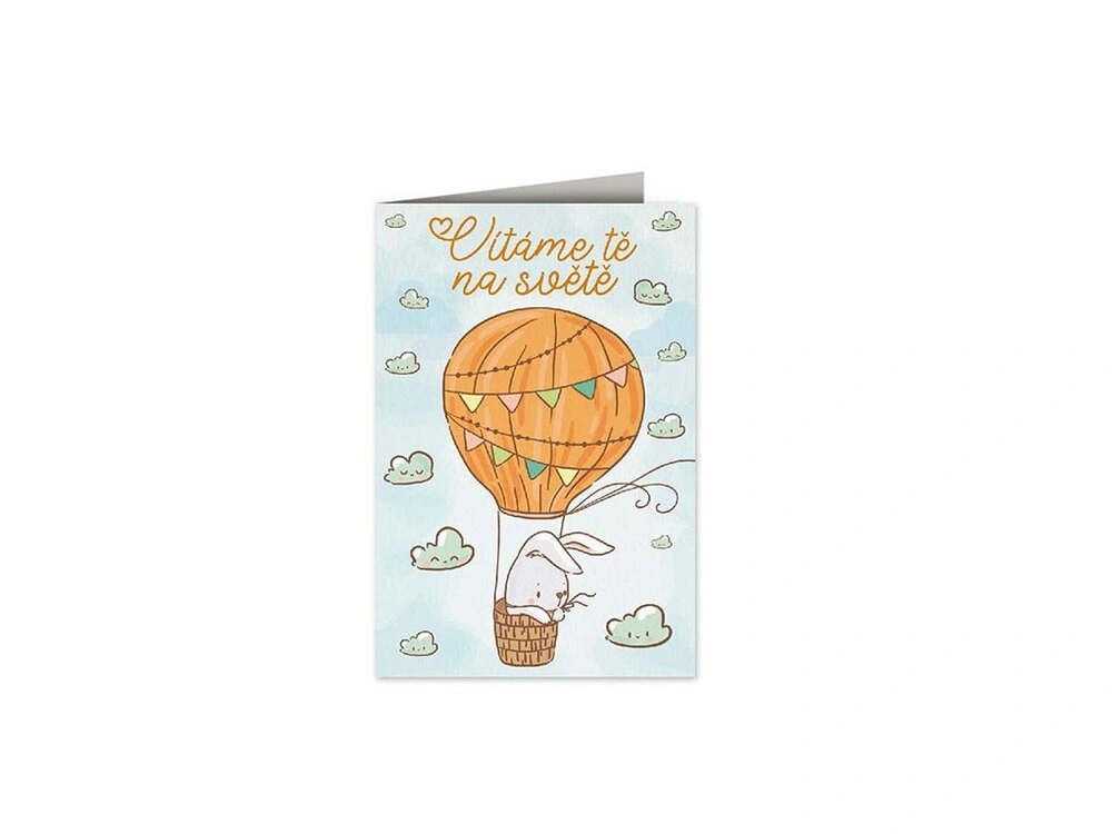 Krásně malované přáníčko v modrých tónech s králíčkem v balónu jako pogratulování k narození nové generace. Potěší, ať už jdete za holčičkou, chlapečkem, nebo se to teprve hodláte dozvědět.