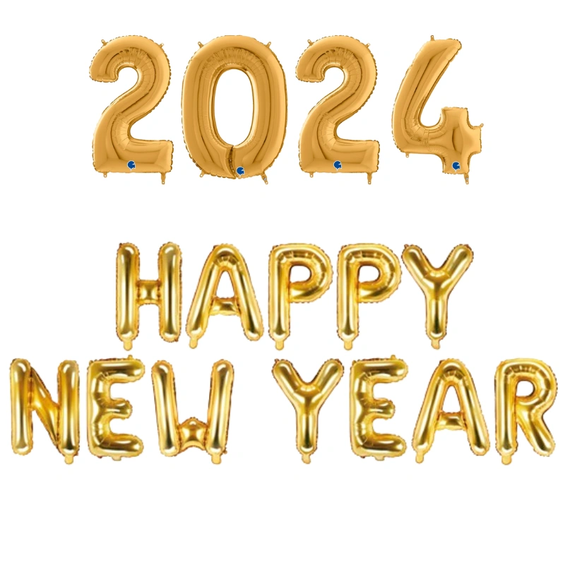 Premium - foliový nápis Happy New Year, 4x číslo (2024), 12x latexový balonek Happy New Year (zlaté, stříbrné)