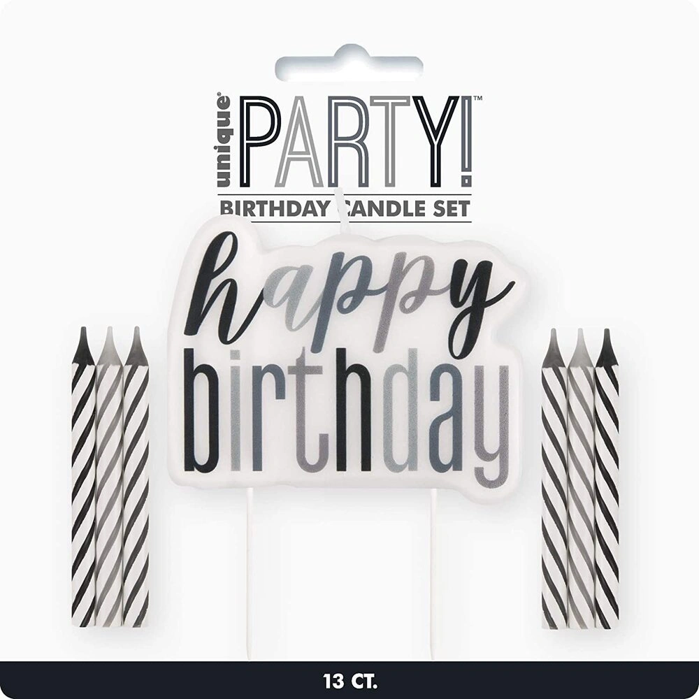 12ks černobílých a stříbrnobílých dortových svíček a 1ks svíčka s černostříbrným nápisem Happy birthday!. Velikost nápisu je cca 7.5x5.5cm.