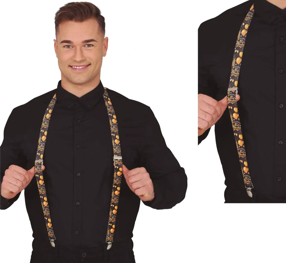 Silvestrovské kšandy s motivy HAPPY NEW YEAR (Šťastný nový rok) ve zlato-černé barvě skvěle doplní váš outfit na silvestrovskou party.