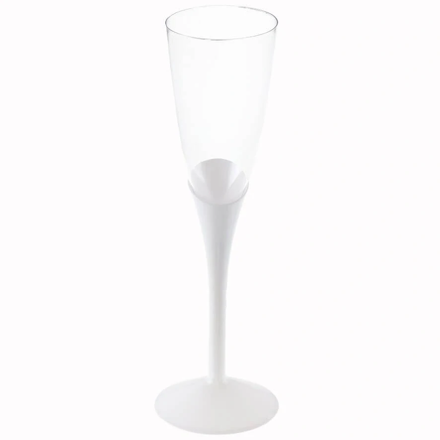 Elegantní plastiková sklenička na sekt s bílým podstavcem, který dodá šmrnc jakékoliv události, kterou pohostí.