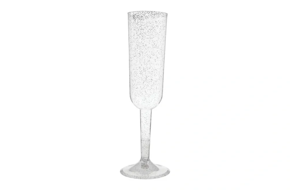 Elegantní plastová sklenička na sekt se stříbrnými detaily, které dodají šmrnc jakékoliv události, kterou pohostí.