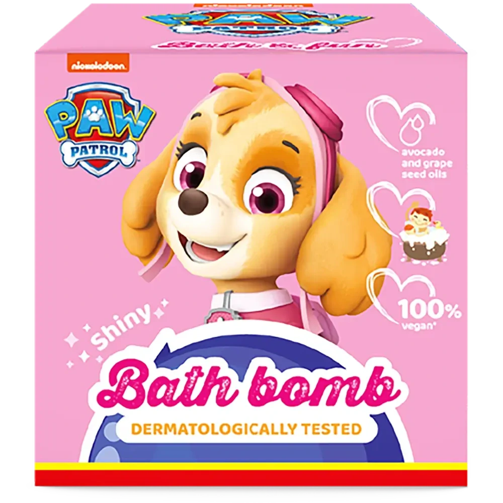 Šumivá koule do koupele s motivem pohádky Tlapková patrola a oblíbené psí hrdinky Skye. Pro děti nazajímavější částí bude, když se koule začně v koupeli postupně rozpouštět, vydávat šumějící zvuky a obarvovat vodu do růžova. Užijte si večerní koupel naplno díky sladké linoucí se vůni a barevné vodě.