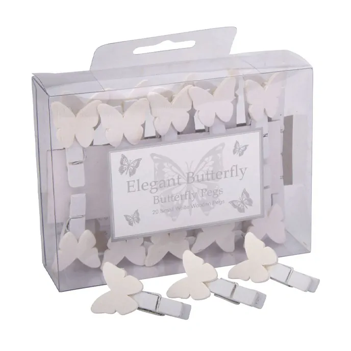 Kolíčky v bílé barvě, které se skvěle hodí na svatební dekorace, ale můžou být použity při jakékoliv jiné akci. Jemný detail motýlka na konci dodá eleganci provedení a bude se skvěle hodit například k jmenovkám ve stejném stylu.