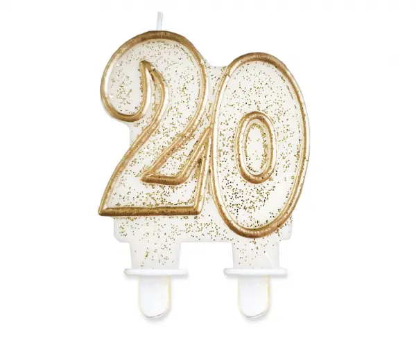 Svíčka ve tvaru číslice 20 ve zlaté barvě se zlatými třpytkami.