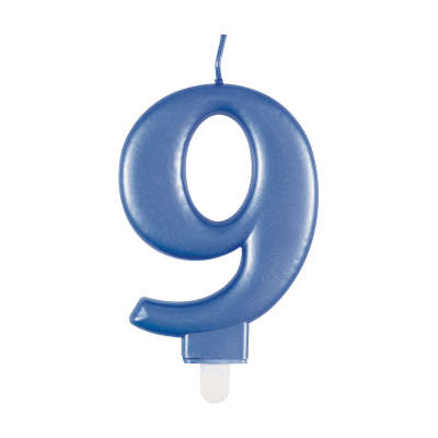 Metalická svíčka modrá, číslo 9. Velikost svíčky je 8cm.