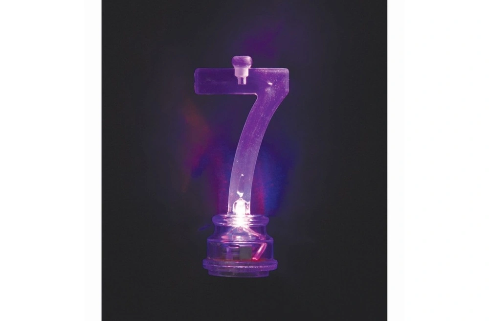 Svítící svíčka, číslo 7. Velikost svíčky je 9.22 x 2.54 x 17.15 cm.