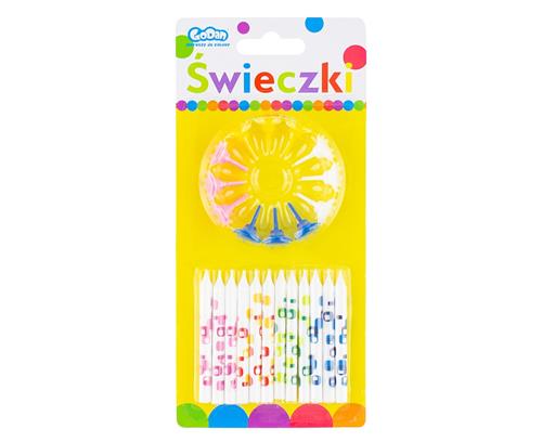 Sada dvanácti kusů narozeninových svíček v bílé barvě s potiskem, balení obsahuje i 12 barevných podstavců.