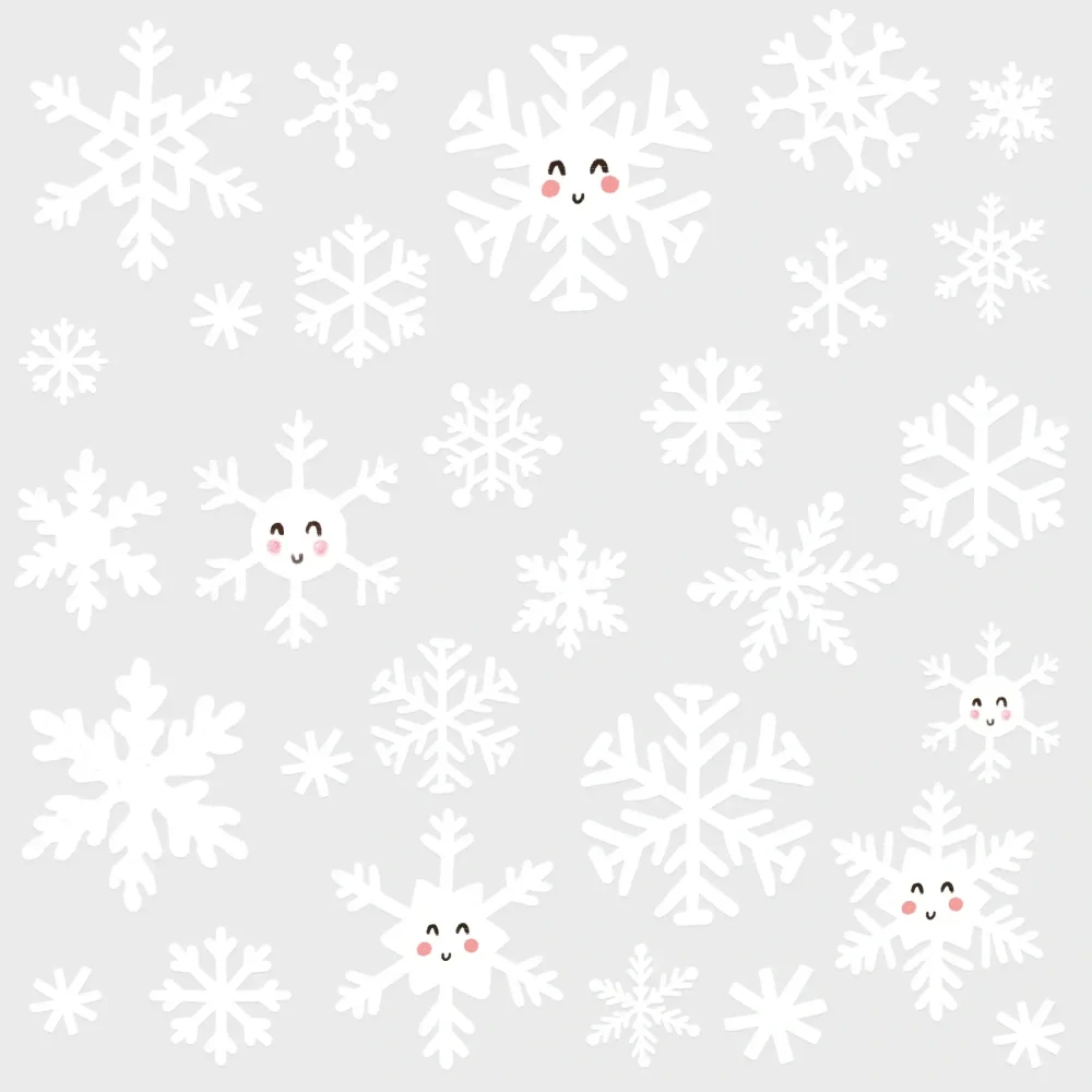 Různé tvary vloček dodají dekoraci přirozenou rozmanitost – od drobných až po větší, s jemnými detaily i vtipné vločky s úsměvem, které potěší hlavně děti. Samolepky se snadno aplikují i odstraňují bez zbytků lepidla, díky čemuž jsou vhodné i pro komerční prostory, školy či kavárny.