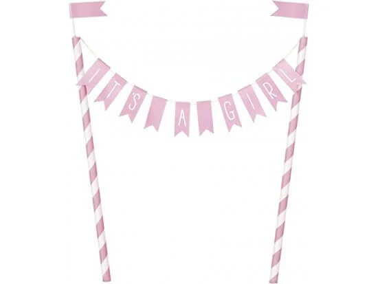 Oznamte všem, že čekáte holčičku tímto zápichem na dort! Dort se tak tane skutečným středem pozornosti. Zápis je ve světle růžové a bílé barvě a obsahuje nápis na vlaječkové girlandě It's a girl. Určitě se bude skvěle hodit na oslavy narození miminka nebo baby shower.