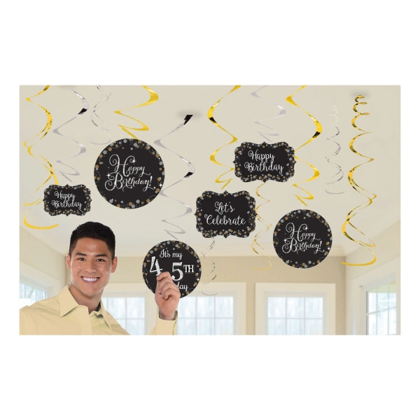 Závěsné spirály v motivu Luxus Gold s nápisem Happy Birthday k doladění oslavy narozenin.